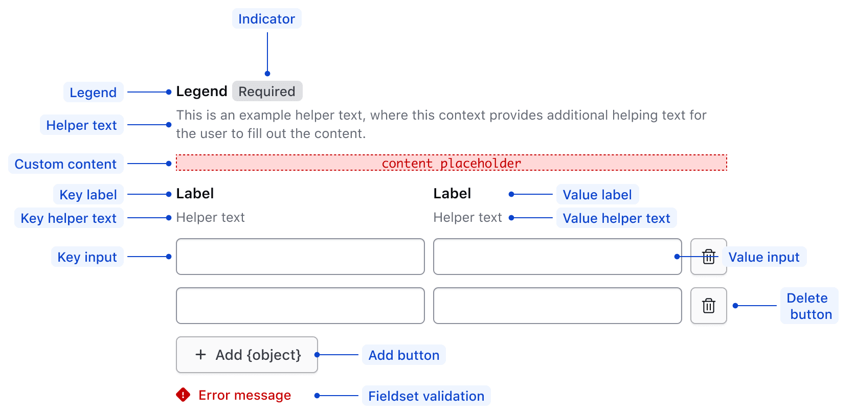 The Key Value Inputs can be validated at the fieldset level or on each individual field. You can choose which level is appropriate depending on the use case, but it is best practice to make any error message as specific as possible. Avoid putting the error on the fieldset if the issue occurs on a single field.